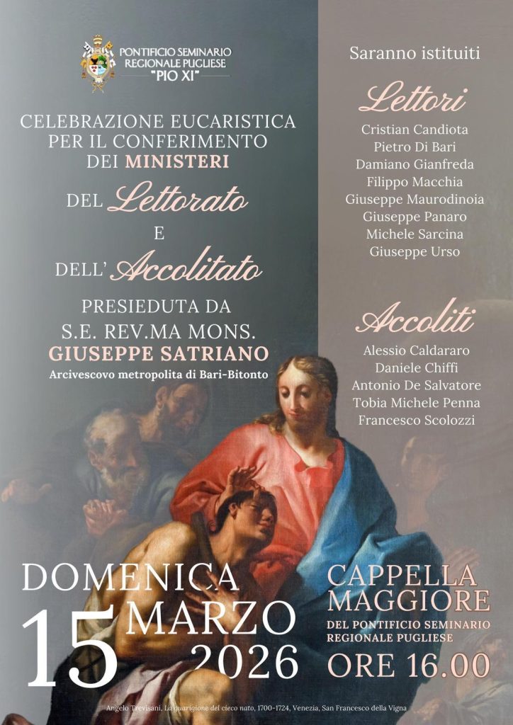 Domenica 15 marzo, presso la ๐๐๐๐๐๐๐๐ ๐๐๐๐๐๐๐๐ del Pontificio Seminario Regionale Pugliese โPio XIโ di Molfetta, ci sarร la ๐ช๐๐๐๐๐๐๐๐๐๐๐ ๐ฌ๐๐๐๐๐๐๐๐๐๐ per il conferimento del ๐ณ๐๐๐๐๐๐๐๐ e dellโ๐จ๐๐๐๐๐๐๐๐๐, presieduta da S.E. Rev. ma Mons. ๐ฎ๐๐๐๐๐๐๐ ๐บ๐๐๐๐๐๐๐, Arcivescovo metropolita di Bari-Bitonto.