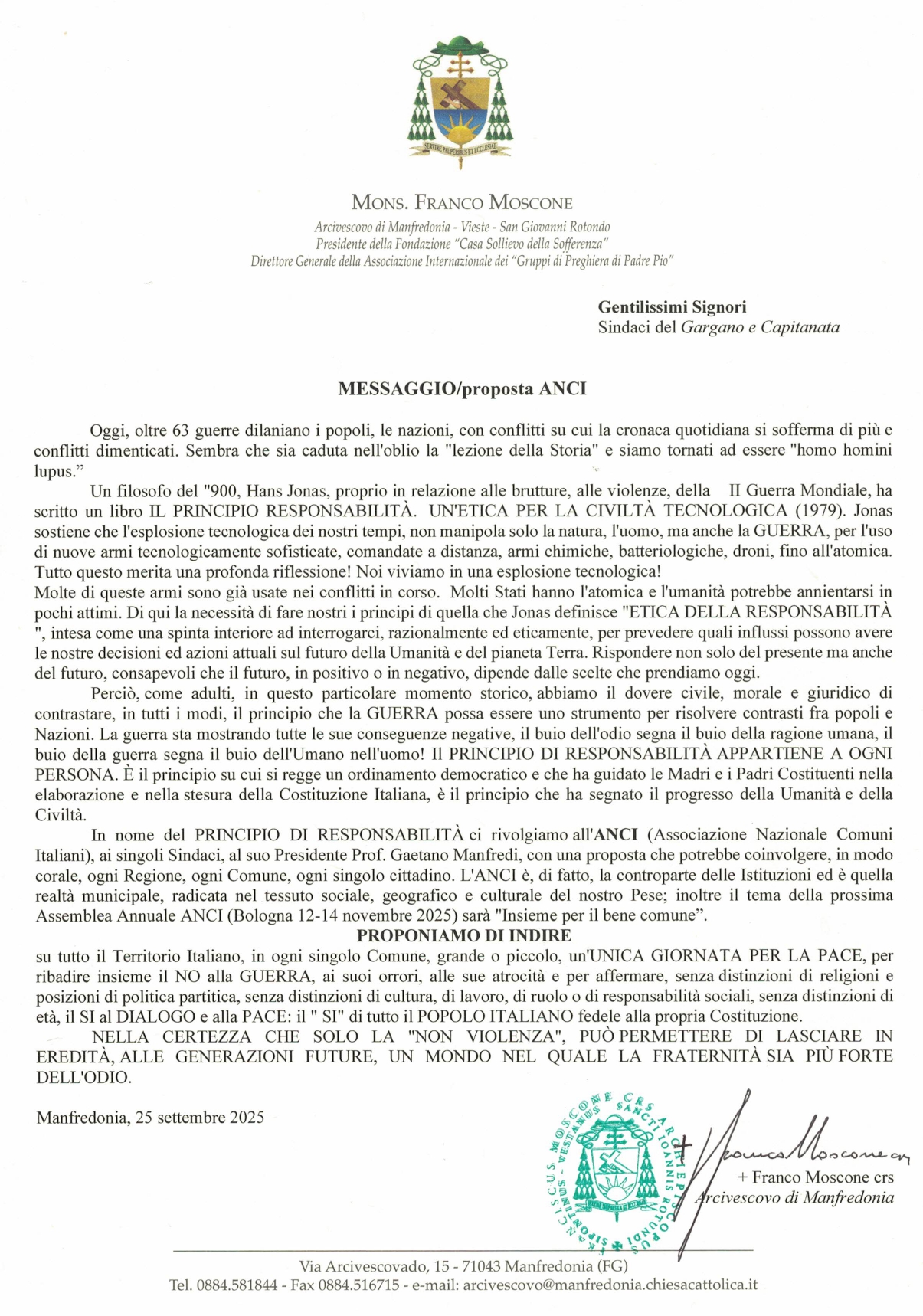 Padre Franco Moscone ha lanciato un appello ai Sindaci della Provincia di Foggia perché sottoscrivano con lui la proposta di istituire una “Giornata per la Pace” promossa dall’ANCI.