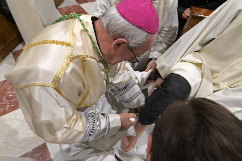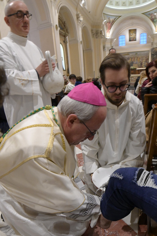 Tra poco come è tradizione, al Giovedì Santo, nella Messa in Coena Domini, faremo il rito simbolico della lavanda dei piedi a dodici persone presenti, che in qualche modo simboleggiano, rappresentano gli apostoli che vissero con Gesù l’esperienza di un discepolato lungo e l’ultima cena con la consegna del memoriale, l’amore agapico di servizio totale e di consegna della vita.