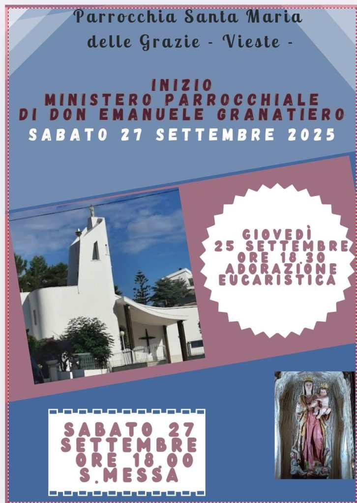 Sabato 27 settembre 2025 presso la Parrocchia “Santa Maria delle Grazie” in Vieste, alle ore 18.00 durante la Celebrazione Eucaristica, Don Emanuele Granatiero inizierà il suo ministero di Amministratore parrocchiale.