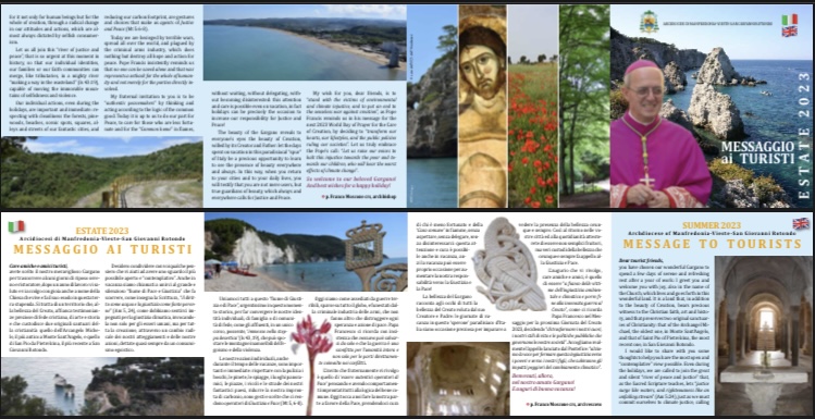 La bellezza del Gargano racconta agli occhi di tutti la bellezza del Creato voluta dal suo Creatore e Padre: le giornate di vacanza in questo ‘sperone’ paradisiaco d’Italia siano occasione preziosa per imparare a vedere la presenza della bellezza ovunque e sempre. Così al ritorno nelle vostre città ed alla quotidianità attesterete di essere non semplici fruitori, ma veri custodi della bellezza che ovunque e sempre fa appello alla Giustizia e Pace.