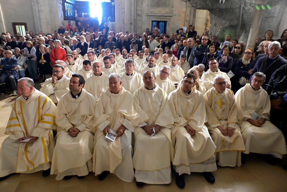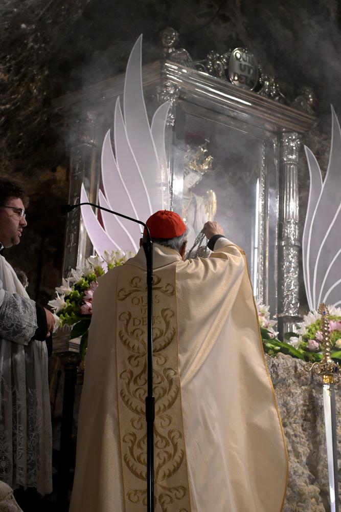 Giungo con devozione grande in questo antico Santuario dove l’arcangelo Michele è, fin dai primi secoli della storia cristiana, particolarmente venerato . Nella tradizione biblica Michele è indicato come colui custodisce il popolo di Dio (cf. Dan 10,13; 12,1) e, in quella cristiana, è, come diceva San Gregorio Magno, l’Arcangelo che «con la sua preghiera ci accompagna verso il Regno dei Cieli» (Liber responsalis, 825: PL 78, 805). La missione affidata da Dio agli Angeli è davvero questa: essere come degli intermediari, che portano a Dio le preghiere e le umane invocazioni rendendole efficaci con la loro intercessione e quindi portano a noi l’aiuto del Signore (cf. San Bernardo, In Cantica 31, 5: PL 183, 943). Eccomi, allora, qui per celebrare con tutti voi l’Eucaristia in un luogo dove tante volte e in tanti modi è stata sperimentata e si ottiene la misericordia di Dio. È un santuario, questo, che la tradizione micaelica intende come un particolare dono Dio: non è stato scelto dagli uomini, ma lo ha scelto Dio stesso per rimettere i peccati degli uomini.