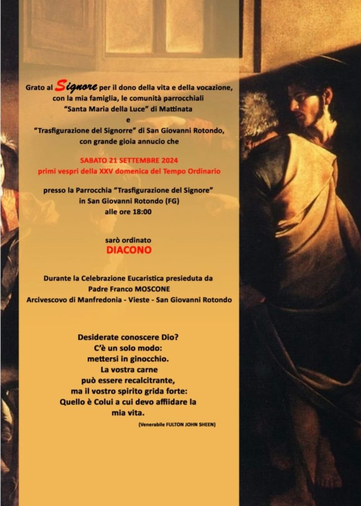 Sabato 21 settembre presso la Parrocchia “Trasfigurazione del Signore” in San Giovanni Rotondo alle ore 18.00 l’accolito Fabio Vecchi sarà ordinato diacono durante la Celebrazione Eucaristica presieduta da Sua Eccellenza Reverendissima Mons. Franco Moscone, Arcivescovo di Manfredonia-Vieste-San Giovanni Rotondo.