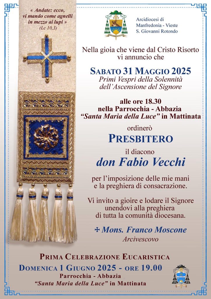 Sabato 31 maggio, Primi Vespri della Solennità dell’Ascensione del Signore, alle ore 18.30, presso la Parrocchia Santa Maria della Luce di Mattinata, durante la Solenne Concelebrazione Eucaristica l’Arcivescovo padre Franco Moscone ordinerà presbitero il diacono Don Fabio Vecchi.