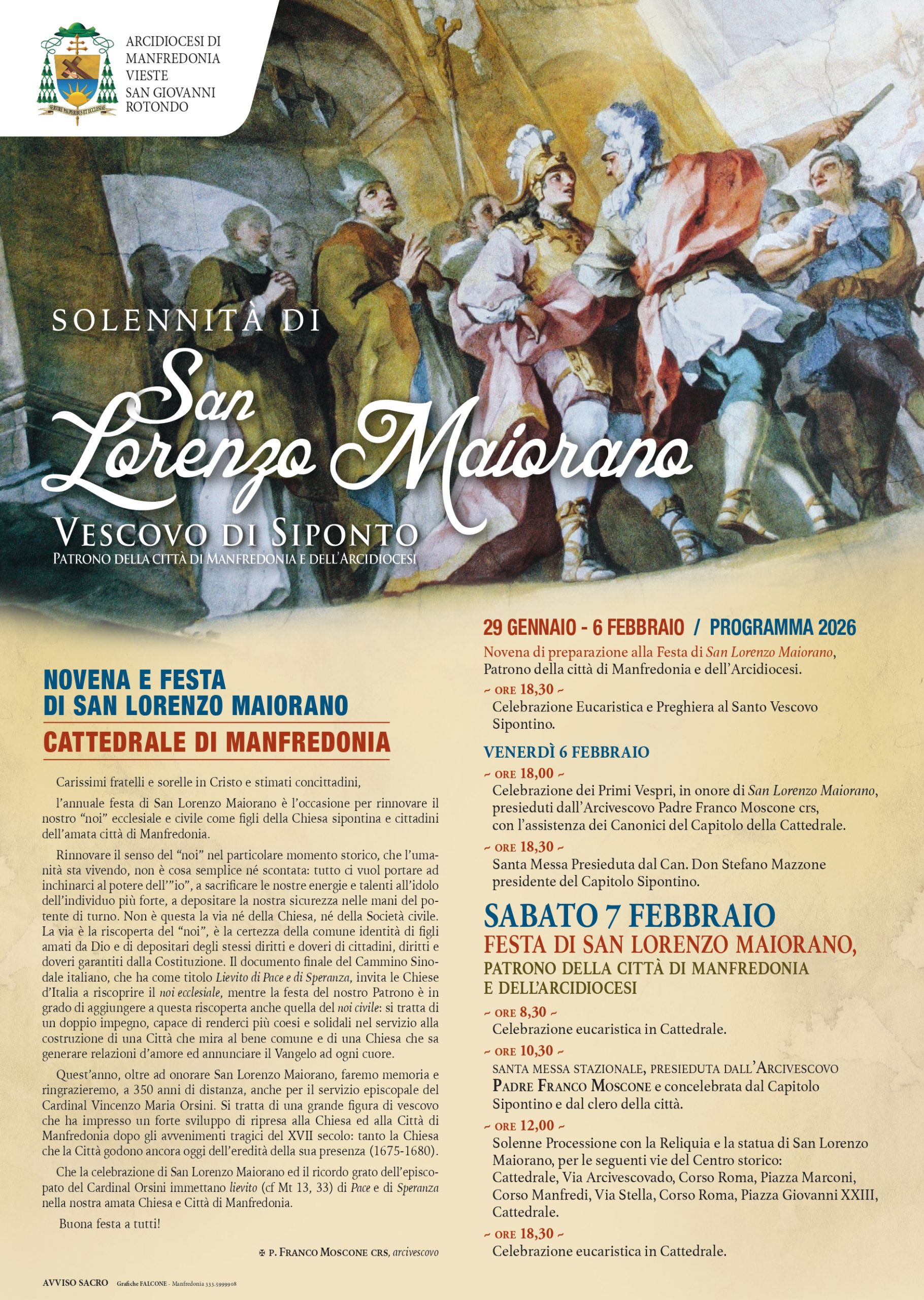 Quest’anno, oltre ad onorare San Lorenzo Maiorano, faremo memoria e ringrazieremo, a 350 anni di distanza, anche per il servizio episcopale del Cardinal Vincenzo Maria Orsini. Si tratta di una grande figura di vescovo che ha impresso un forte sviluppo di ripresa alla Chiesa ed alla Città di Manfredonia dopo gli avvenimenti tragici del XVII secolo: tanto la Chiesa che la Città godono ancora oggi dell’eredità della sua presenza (1675-1680).