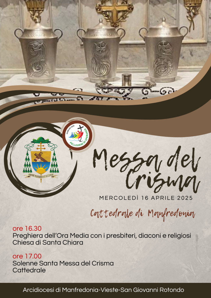 Mercoledì 16 aprile 2025, alle ore 17.00, presso la Cattedrale di Manfredonia, l’Arcivescovo Mons. Franco Moscone presiederà la Santa Messa del Crisma.