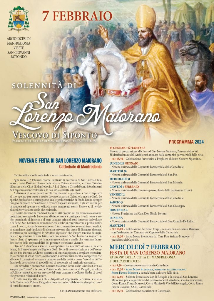 Cari fratelli e sorelle nella fede e amati concittadini, ogni anno il 7 febbraio ritorna puntuale la solennità di San Lorenzo Maiorano: come Pastore colonna della nostra Chiesa sipontina, e come Cittadino difensore della Città di Manfredonia. A Lui Chiesa e Città debbono i fondamenti dell’organizzazione ecclesiale e le basi della corretta vita civile.