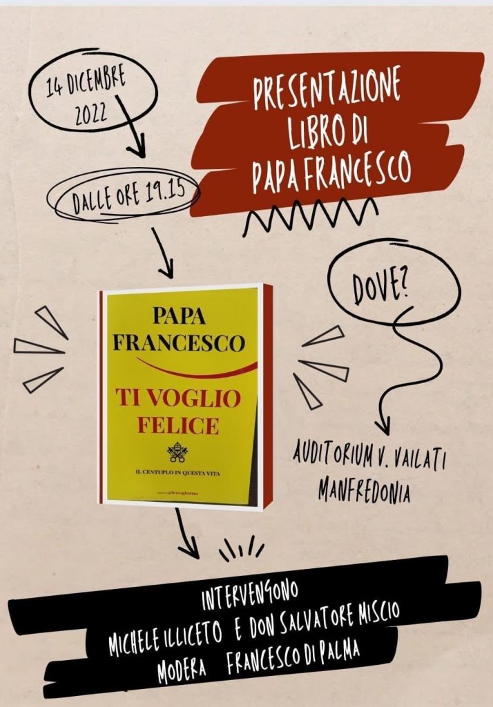 Mercoledì 14 dicembre 2022, alle ore 19.15 nell’Auditorium V. Vailati, ci sarà la presentazione dell’ultimo libro di Papa Francesco dal titolo “Ti voglio felice”.